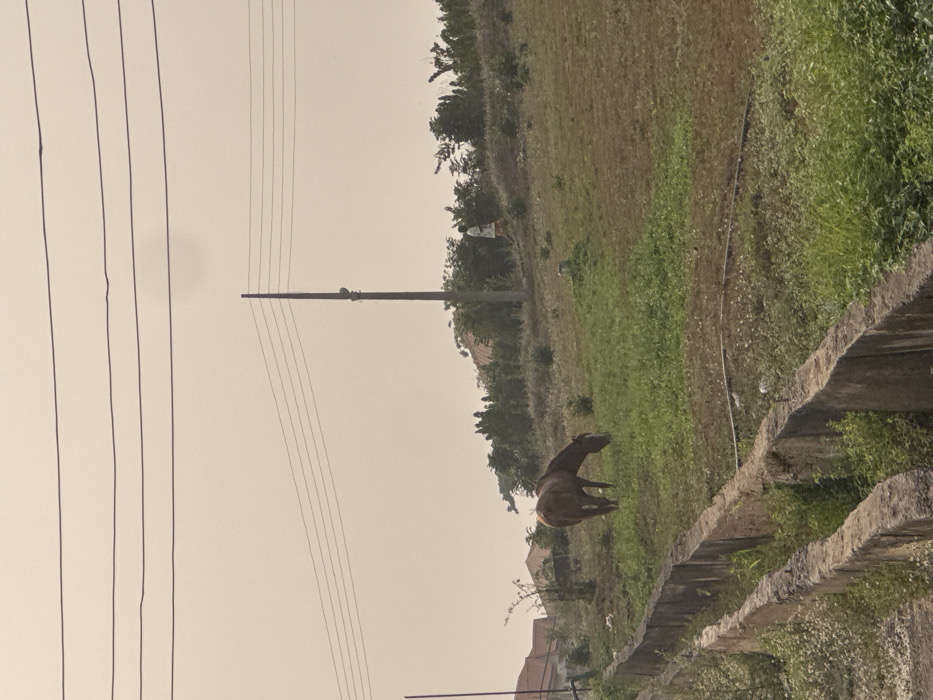 A horse grazes in a green field alongside a concrete retaining wall. A utility pole rises in the distance, power lines stretching across a hazy sky. Patches of trees dot the landscape. In the far distance a white figure stands. The scene evokes a rural atmosphere with a blend of nature and infrastructure.