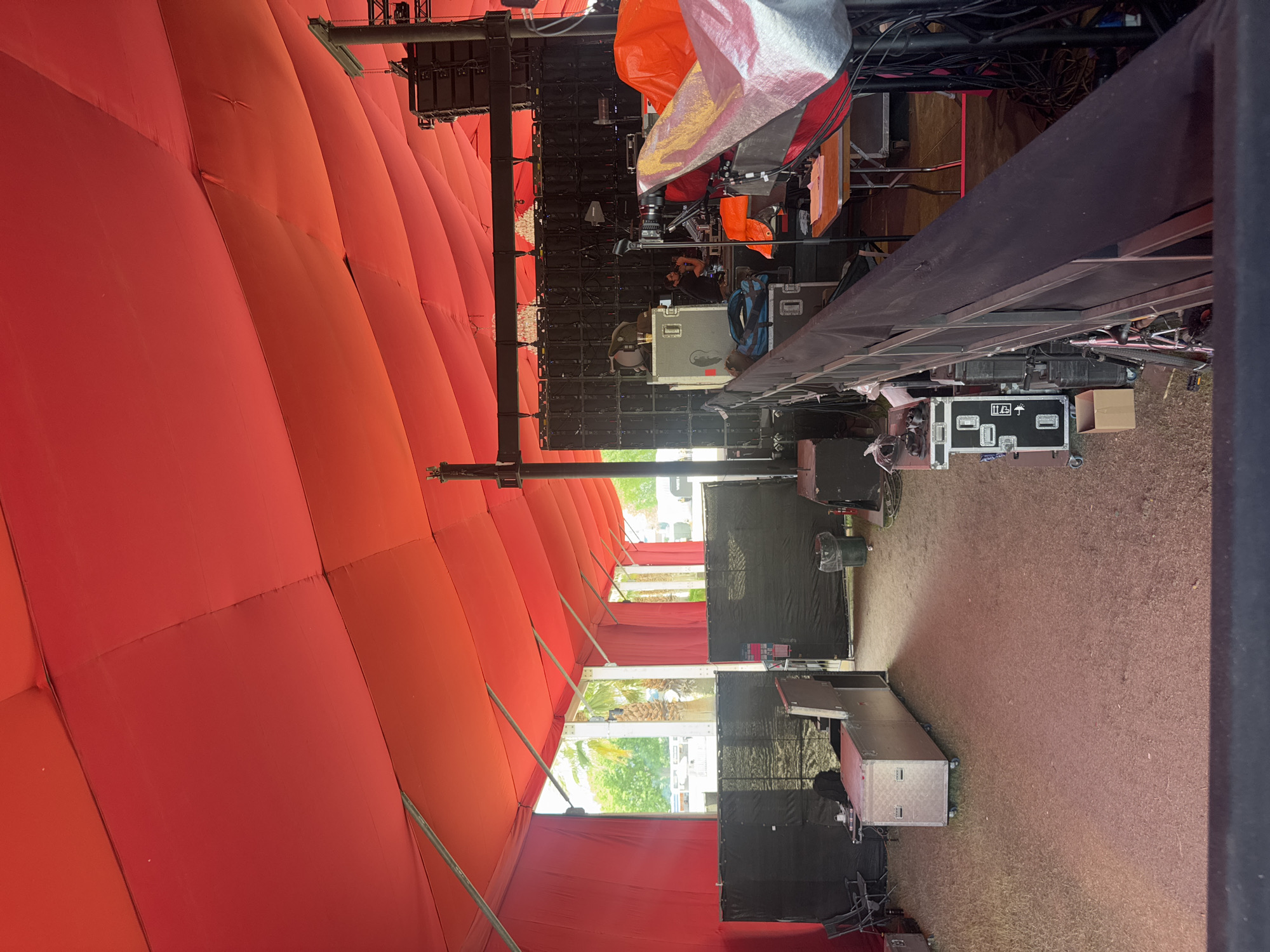 The image, taken inside a large red tent, shows a stage area with lighting and sound equipment
