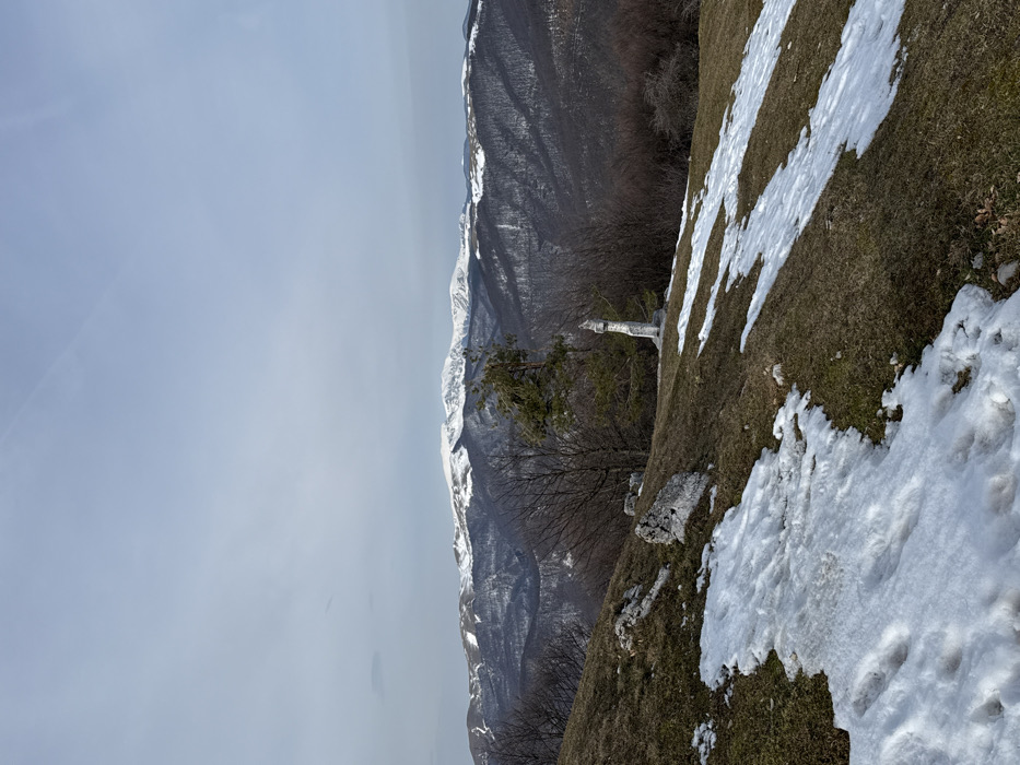 The scene depicts a mountainous landscape near Shipka, Bulgaria. The foreground features an upward-sloping hillside with irregular patches of snow alternating with dormant brown-green grass. Several light-colored rock formations are visible on the left side of the slope, and footprints are present in the snow patches. In the midground, a singular evergreen tree with dark green foliage stands centrally, positioned to the left of a narrow, light-colored, columnar stone monument or marker. Surrounding these are numerous bare deciduous trees. The background is dominated by a distant mountain range, its peaks extensively covered in snow, while the lower slopes are densely forested with dark trees. The sky is overcast, a uniform pale gray-blue, with a faint linear atmospheric trail present in the upper right. No individuals or specific activities are observed.