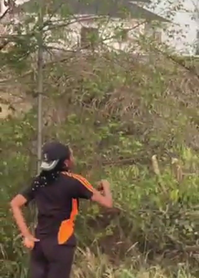 A person in black pants, a black and orange shirt, and a black cap is holding a basketball in their right hand with their arm extended upward. They turn towards a second person wearing blue shorts, a black shirt with white and blue accents, and a black cap. The background includes overgrown foliage and a light-colored building. The ground is dirt. The first person appears to be preparing to shoot the basketball while the second person observes with hands on hips.