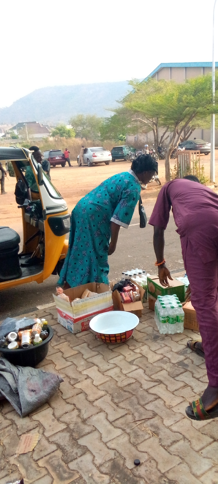 A yellow tuk-tuk sits next to a woman in a blue patterned dress who is bending over boxes and a white bowl. Another person, wearing purple and sandals, is also leaning over the goods. The items include bottles, drinks, and boxed goods. People and cars are visible in the background, along with trees and a building. Mountains are in the far distance. The surface is paved with interlocking blocks.