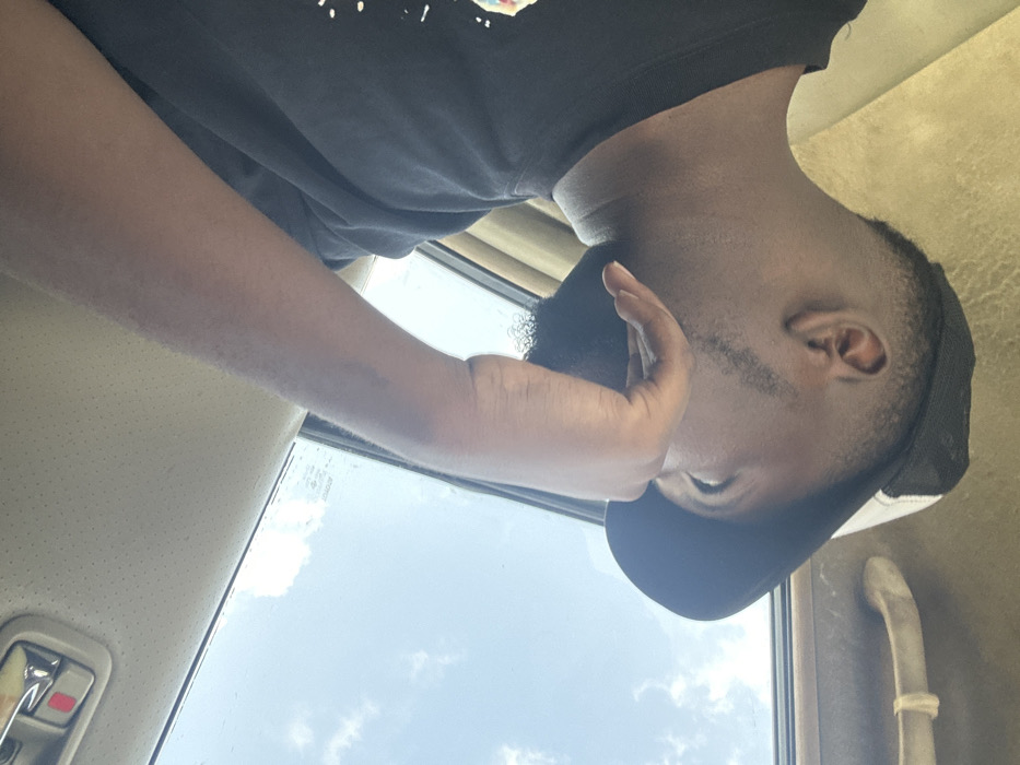 A male individual is observed from the right side, seated inside a vehicle during daylight hours