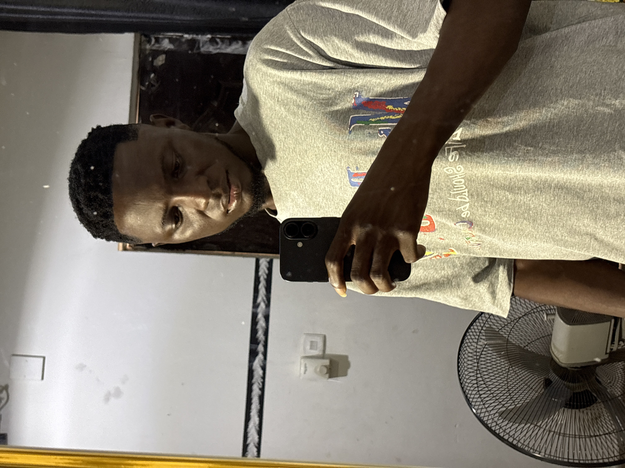 An adult male stands indoors, capturing a mirror selfie with a black smartphone, positioned in Lafia, Nigeria. He is dark-skinned with short dark hair and minimal facial hair, wearing a light grey short-sleeved t-shirt featuring a colorful graphic design on the chest. His gaze is directed downwards towards the phone. The background, reflected in the mirror, consists of a light-colored wall with a black and white patterned horizontal border. A white wall-mounted dispenser and an electrical switch are visible on the left wall section. A black oscillating stand fan is present in the lower-left corner. A dark doorway or frame is partially visible behind the subject on the right. A golden frame borders the mirror on the left.