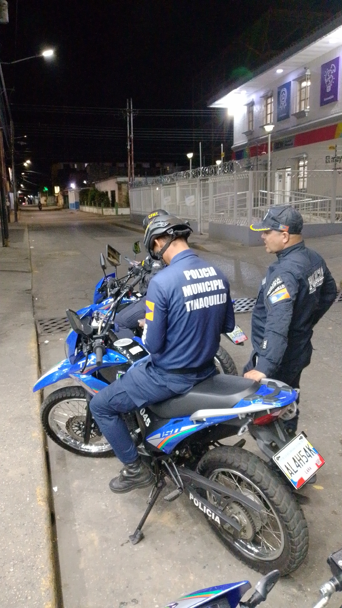 Two uniformed police officers are positioned on a street at night in Tinaquillo, Venezuela. One officer is seated on a blue and black motorcycle with the word "POLICIA" written on it, and the license plate number "AL4H54K". The officer's uniform has the words "POLICIA MUNICIPAL TINAQUILLO" on the back. The second officer is standing beside the motorcycle, wearing a cap and a jacket with a patch on the sleeve. In the background, there is a building with lights on and various signs. There are street lights visible and a sidewalk bordering the road.