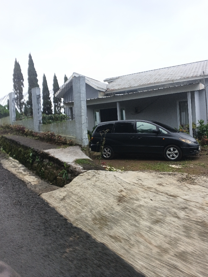 The scene depicts a static exterior view of a residential property in Masaiti, Zambia, under an overcast sky. In the foreground, a dark asphalt road transitions into a textured concrete driveway leading up to the property. A concrete drainage ditch runs along the left edge of the driveway. The property features a single-story house with light grey walls and a light-colored, possibly corrugated metal, sloped roof. A covered porch area extends from the front of the house. A low concrete wall topped with a dark metal fence marks the property boundary, with a concrete pillar visible at the driveway entrance. Several tall, slender conifer trees are planted behind the fence on the left side of the property. A black minivan, identified as a Toyota Previa/Estima model with silver multi-spoke alloy wheels, is parked on a dirt patch in front of the house, facing left. No individuals or active subjects are present in the image.