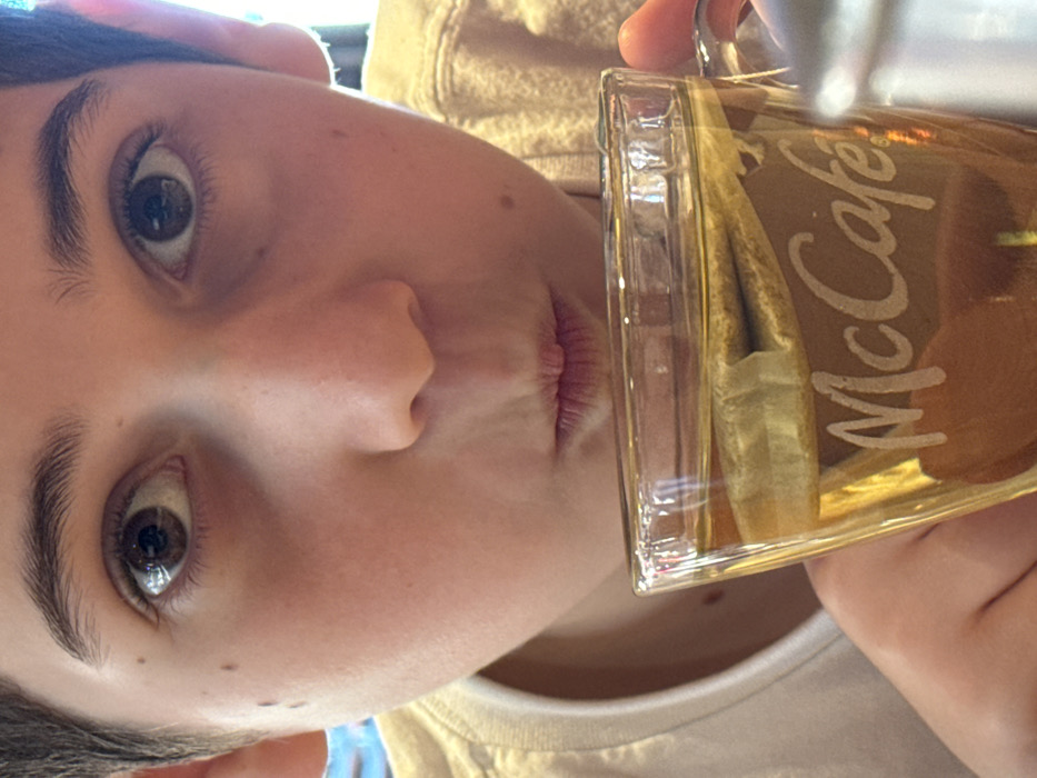 A close-up, eye-level image captures a young individual with fair skin, dark hair, and brown eyes, looking directly into the camera. Their mouth is puckered, suggesting either blowing on a beverage or making a specific facial expression. The individual is holding a clear glass mug with the "McCafé" logo etched on its side. The mug contains a light amber liquid and a submerged tea bag. A portion of the individual's right hand is visible on the mug handle. The subject is wearing a light-colored t-shirt, with a light brown garment partially visible on the right. The background is blurred, indicating an indoor setting. This scene is located in Lipomo, Italy.