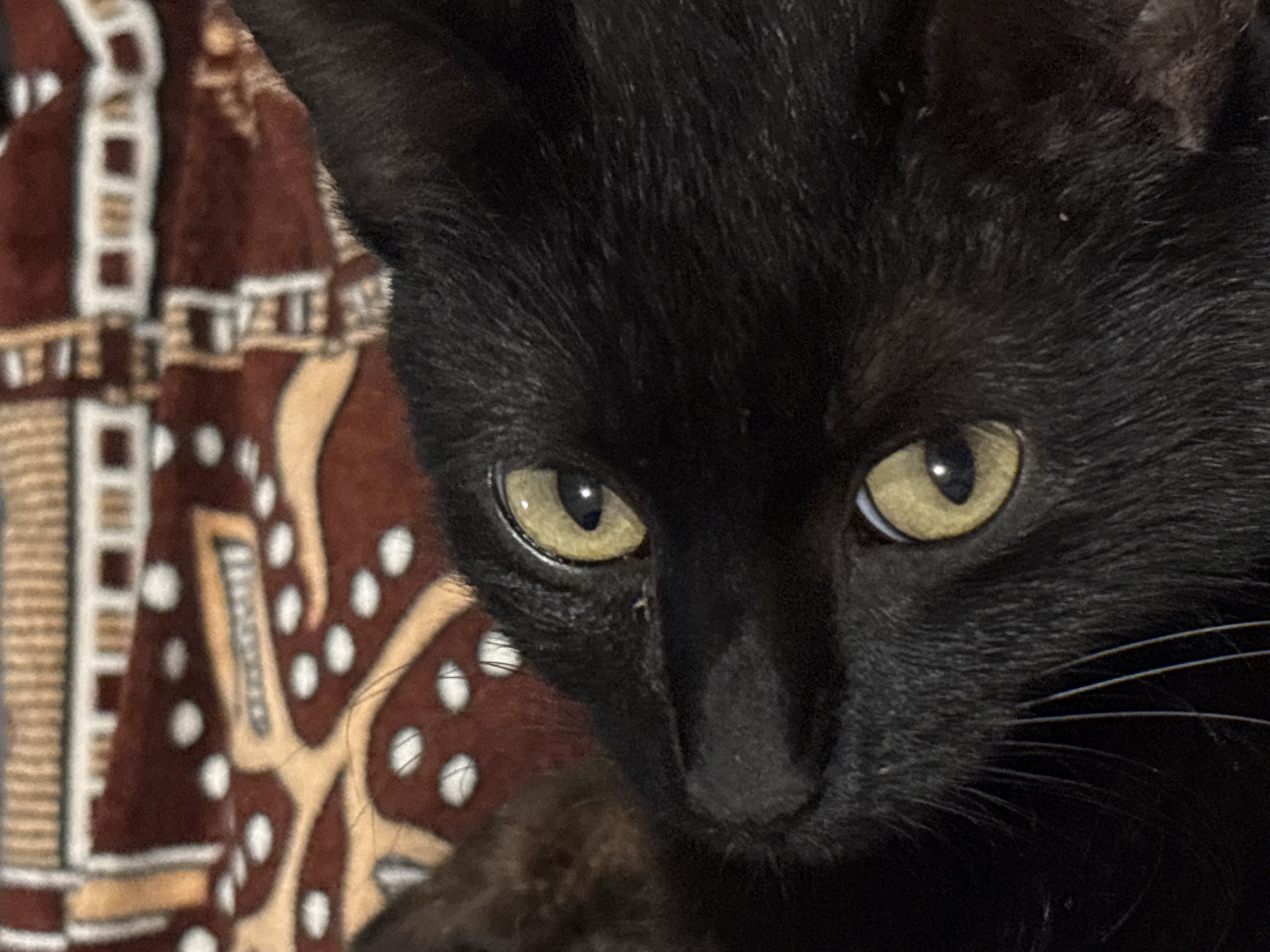 - "A close-up image depicts the head of a black cat oriented upwards and slightly to the viewer's left" by FM-UCF3H3, licensed under CC BY 4.0