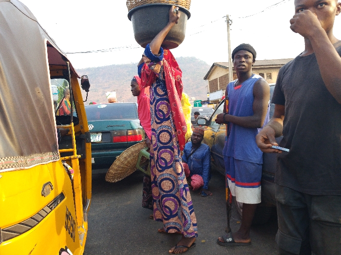 The image depicts a busy street scene in Lokoja, Nigeria, under bright daylight conditions