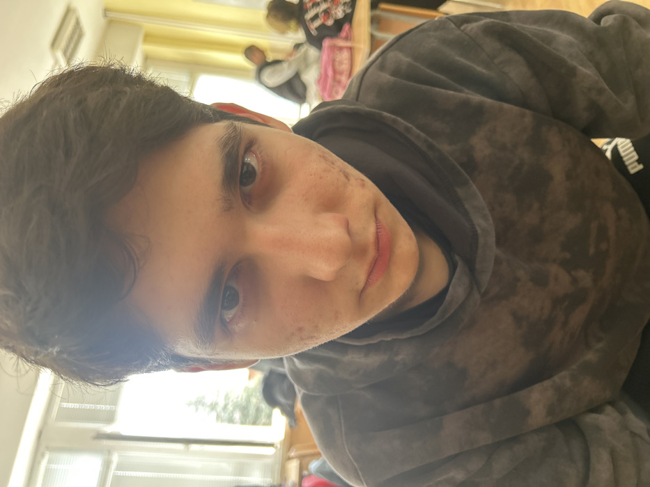 The image depicts a young male in a classroom located in Pravets, Bulgaria. The subject, positioned centrally and occupying the majority of the foreground, is a male with dark hair, dark eyes, and a neutral expression, looking directly at the viewer. His face exhibits visible blemishes. He is wearing a dark-toned, possibly tie-dye or distressed, hooded sweatshirt. A black garment with a white "PUMA" logo is visible at the bottom of the frame. The background is blurred but reveals an indoor setting consistent with a classroom. To the left, a multi-paned window provides bright natural light, with a coniferous tree visible outside. To the right and rear of the subject, several other individuals are present, seated at desks. One blurred figure appears to be an adult male wearing a light-colored vest. Another individual in the mid-ground wears a dark top with a white graphic design. Desks and chairs are present, along with a pink object, possibly a pencil case, on a desk surface. The ceiling features fluorescent lighting fixtures, and the walls appear light-colored with a distinct vertical yellow element on the right side of the frame. No specific actions or interactions are discernible beyond the individuals' presence in the classroom.