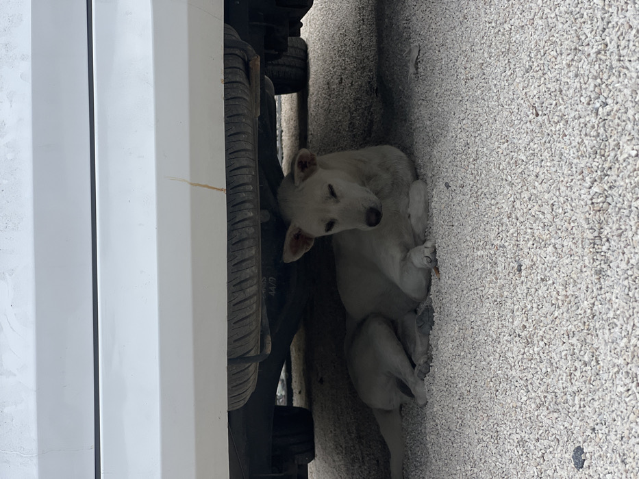 A white dog rests in a narrow space between a parked vehicle and a textured concrete surface. The dog appears to be sleeping or resting with its eyes closed, curled up against the concrete. The vehicle's white exterior and tire are visible, creating a confined environment for the dog. The setting suggests a sheltered spot, possibly chosen by the dog for safety or comfort.