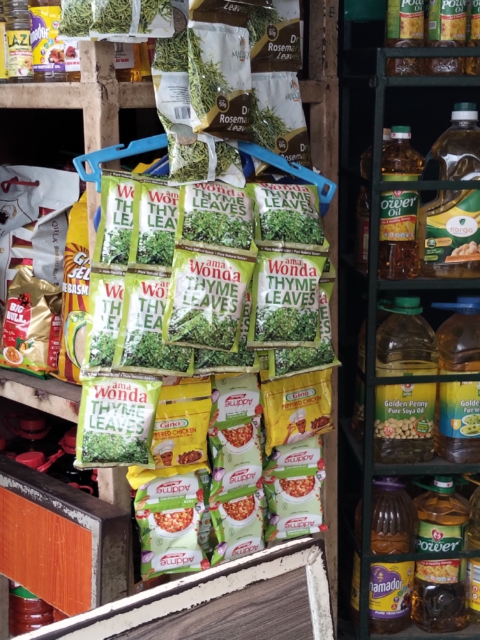 A cluttered display features an assortment of food items. Packages of "Wonda Thyme Leaves" and "Marico Dry Rosemary Leaves" hang from a blue hanger. Below these are packets of "Gino Peppered Chicken" and "Addme" products. To the left, there are bags of rice, "Big Bull" snacks, and "G&SEL Basmati." On the right, a shelf holds various brands of cooking oil, including "Power Oil," "Morga," "Golden Penny Pure Soya Oil," and "Namador."