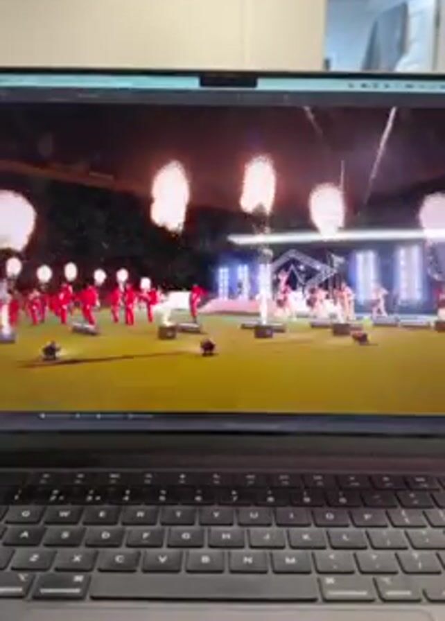 A person is watching a video on a laptop. The video shows a live performance with dancers on a field. The dancers are wearing red, white, and black costumes. There are stage lights and pyrotechnics. The laptop is open and on a table. The background is a blurry room.