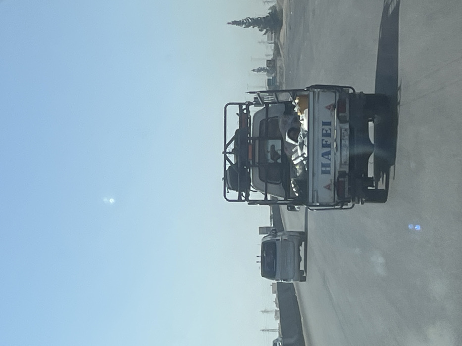 The image depicts a daytime scene on a multi-lane asphalt road in the city of Duma, Syria. The perspective is from within a moving vehicle, looking forward. In the midground, a white Hafei brand pick-up truck travels in the rightmost lane. This truck features a full metal cage rack over its bed and cab. The truck bed contains various items, including what appears to be rolled bedding or fabric, a yellow container, and other dark objects; a person is discernible lying covered within the truck bed. On the roof rack above the cab, dark bags or luggage are secured. Ahead of the pick-up truck, a silver or white minivan-style vehicle proceeds in the same lane. To the far left, another vehicle is partially visible. The road's left side features a concrete barrier, with utility poles and lines visible in the distant background. The right side of the road transitions to a dirt shoulder, beyond which several tall, conical evergreen trees are sparsely distributed. The sky is clear and light blue, indicating bright conditions, with subtle lens flares present on the road and in the sky. All visible vehicles are in motion.