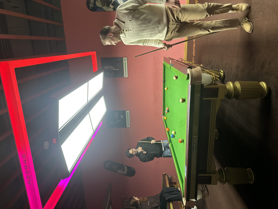 The scene is a billiards hall in Huangdao District, China