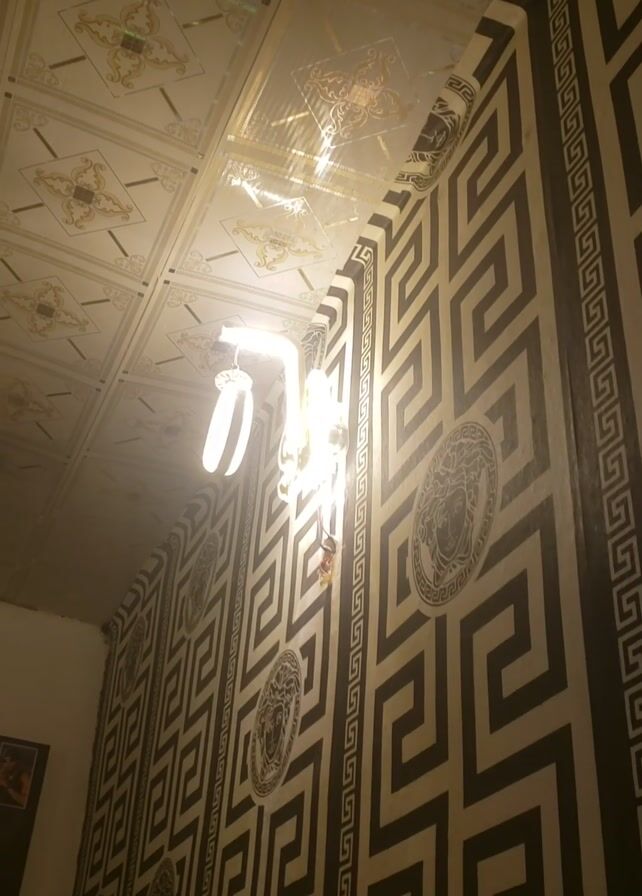 The video pans around a small room with decorative tiling on the walls and a black and white patterned ceiling