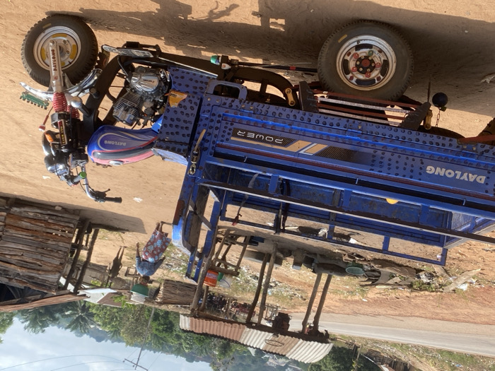 The scene depicts an outdoor environment in Okura, Nigeria, under clear daylight conditions. A blue Daylong brand three-wheeled cargo motorcycle is centrally parked on a reddish-brown dirt ground. The vehicle features a perforated metal cargo bed with "DAYLONG" and "POWER" branding visible, a motorcycle front end with a blue and red fuel tank, and a visible engine. A yellow object rests within the cargo bed, and a black spherical object hangs from the rear chassis. To the left of the motorcycle, an unpaved shoulder borders an ascending paved road. This area contains scattered debris, including discarded tires and wood, alongside rustic structures with corrugated metal roofs. To the right of the motorcycle, a dirt path extends towards a collection of simple, horizontally planked wooden structures with corrugated metal roofs, indicative of a village or settlement. In the mid-ground, a woman wearing a blue and white patterned dress walks away from the viewer, carrying a white basin on her head. Further back and to her right, a child is observed walking towards the wooden structures. The background includes distant hills covered in green vegetation, and utility poles with lines are visible against a bright blue sky with sparse clouds.