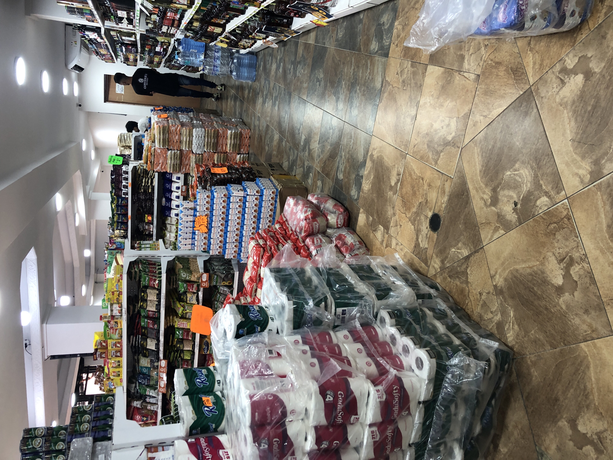 The image depicts the interior of a supermarket in Juan Griego, Venezuela. A person is walking along an aisle in the distance. The aisle contains shelves stocked with various products, including toilet paper, bottled water, food items, and canned goods. The floor is covered with brown patterned tiles. Packages of toilet paper are stacked in the foreground. The store appears well-lit with recessed lighting.