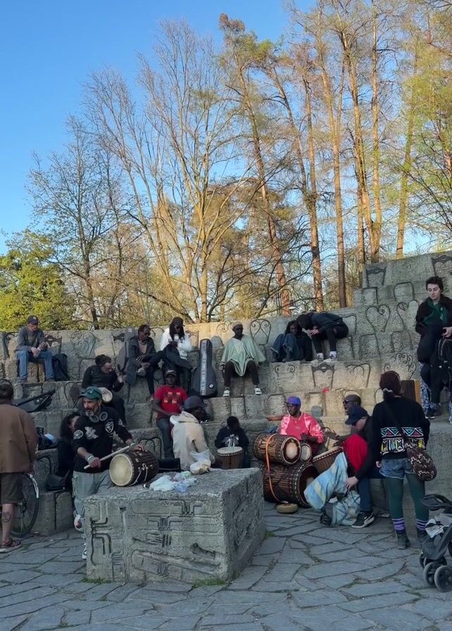 Several people are gathered at a public space, possibly a park or amphitheater, engaging in musical activities and socializing. Most of the group is situated on a series of tiered stone steps with carved decorative elements. Some individuals are playing various types of drums, while others appear to be spectating or participating passively. The drummers include individuals wearing hats, colorful shirts, and some with traditional African garments. Several people are sitting or standing on the stone steps behind the musicians. One individual has a guitar case leaning against the wall, while others are simply seated and watching. There are also people standing around the perimeter of the group, including a person pushing a stroller. The environment is outdoors under a clear blue sky. Tall, bare trees surround the gathering space, with some showing signs of early spring foliage. A bicycle is visible leaning against the stone structure near the edge of the frame. The overall atmosphere is relaxed and communal, suggesting a spontaneous music session or jam.