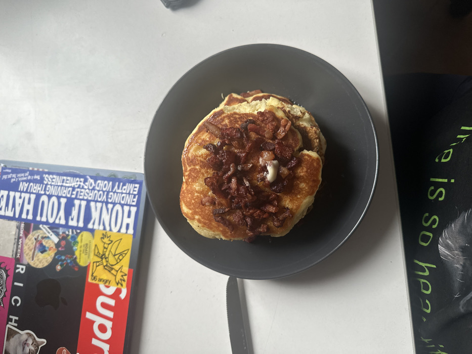A stack of pancakes covered in bacon bits rests in a gray bowl. A pat of butter melts on top. A knife sits next to the plate on a white surface. To the left, a laptop with stickers, including a large "Supreme" logo and "Honk if you Hate...Finding Yourself Driving Thru An Empty Void of Loneliness." To the right, a black t-shirt with white text and a gray graphic is partially visible. The shirt's text reads, "life is so hea."
