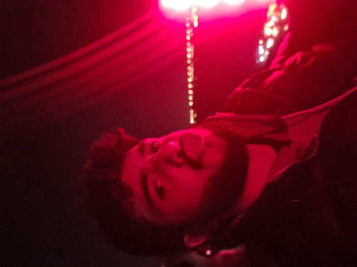 A person with dark curly hair and a beard is under intense red lighting. The person's face is angled upward, looking directly at the camera. Some shiny objects are visible in the background, possibly lights or decorations, blurred by the red hue. Dark clothing is visible.