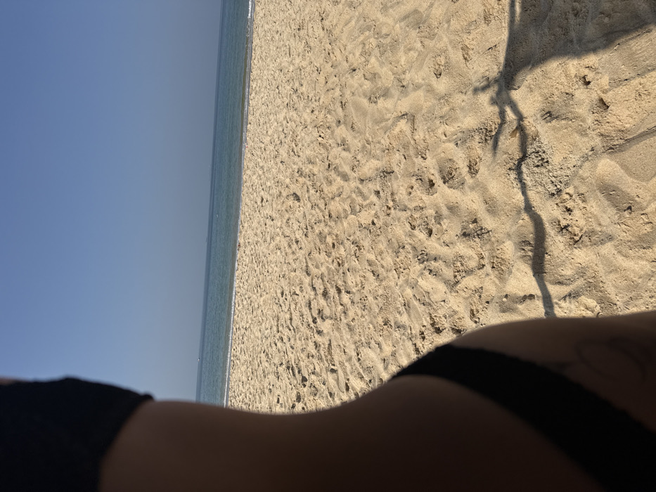 A beach scene, possibly from a first-person perspective. A stretch of sandy beach fills the right side, with an indistinct shadow falling across. The ocean meets the shore along the left side, with clear blue sky above. Part of a person's body, wearing what appears to be black swimwear, is visible in the foreground. A faint design, likely a tattoo, can be seen on the skin.
