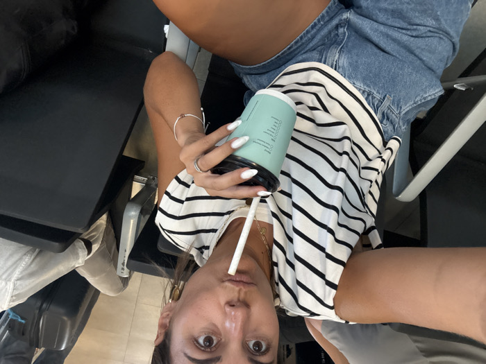 A woman seated, facing the camera in an unconventional angle. She's in a striped shirt and denim shorts, holding a turquoise cup with a straw. White painted nails are visible. An array of accessories, including rings, bracelets, and hoop earrings, adorn her. Seated in what appears to be a public waiting area, evidenced by the rows of chairs and tables, the woman captures a selfie.