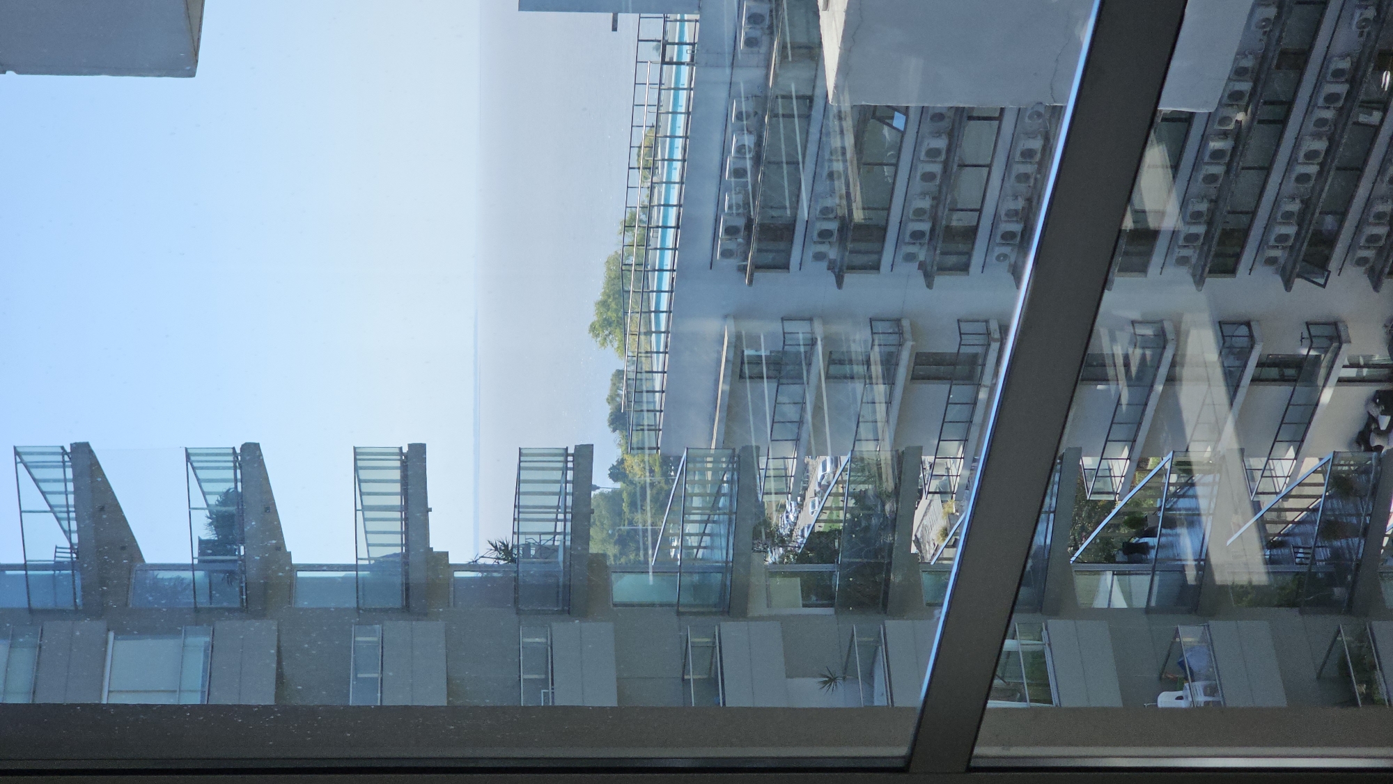 From the city of Vicente López, Argentina, a view through a window shows two buildings. The building to the left features balconies with glass barriers and plants. The building to the right has numerous air conditioning units along its facade. A swimming pool is visible atop one of the buildings. The sky is clear and blue. The scene appears to be a reflection.