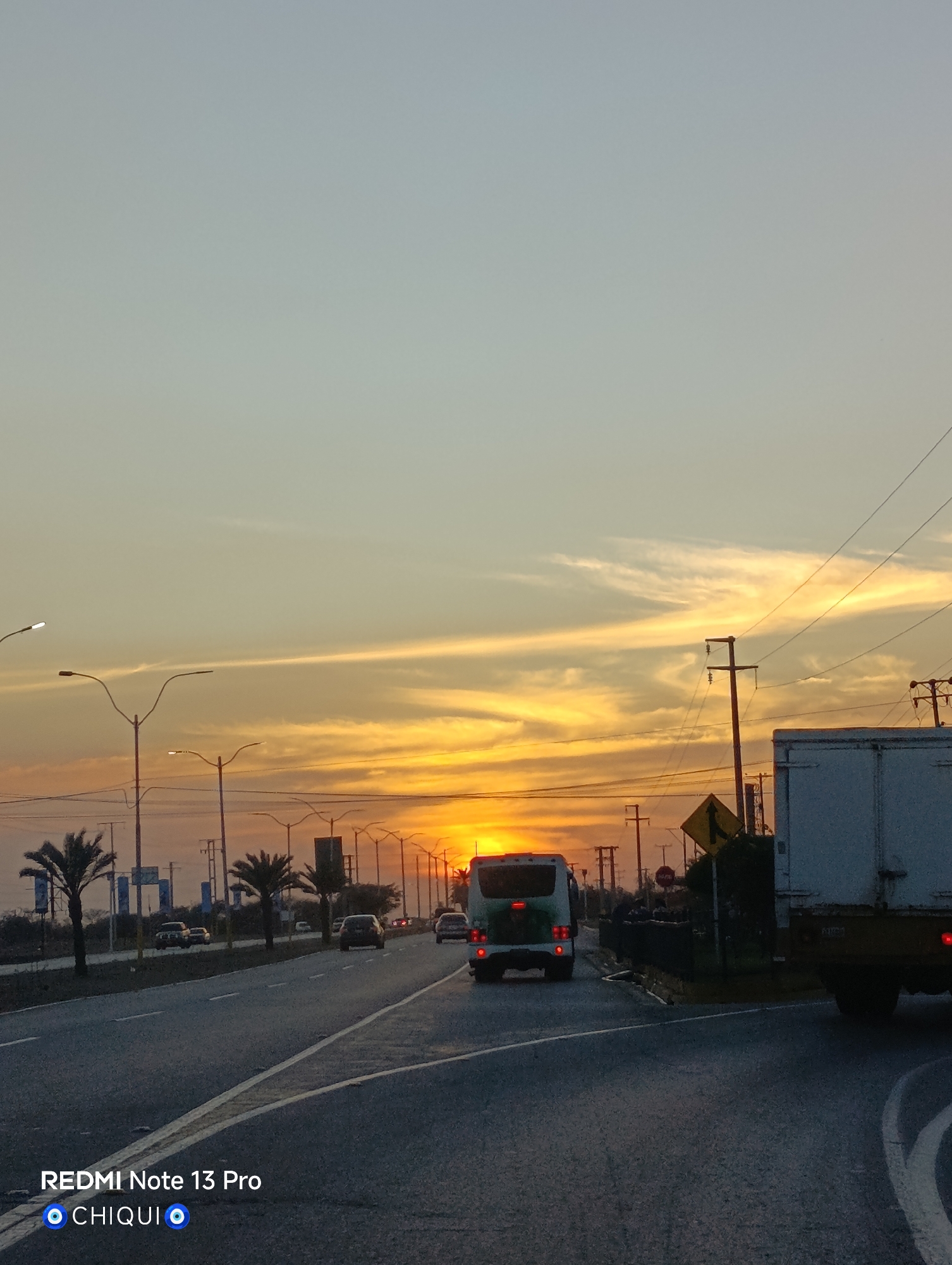 highway at dusk or dawn in El Dátil, Venezuela. The sky is a gradient of colors, from light blue to orange near the horizon. The sun is low, appearing to be either rising or setting. Palm trees and utility poles line the side of the road. Several vehicles, including a bus and a box truck, are visible on the highway. A pedestrian crossing sign is on the right side of the road. The road is marked with painted lines. A text overlay in the lower left corner says "REDMI Note 13 Pro, CHIQUI."