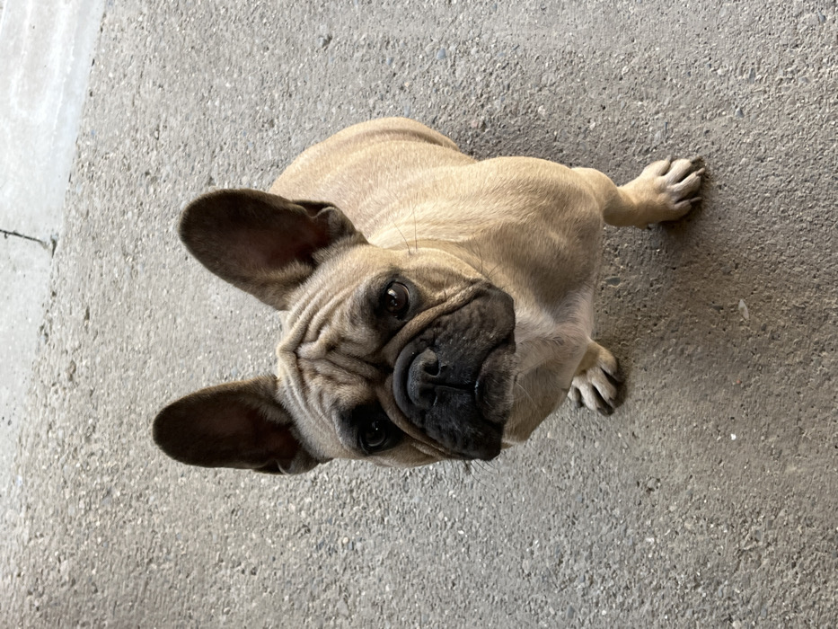 - "A fawn-colored French Bulldog is centrally positioned, gazing upwards towards the camera from a low stance on a light gray concrete surface" by FM-yO5cv1, licensed under CC BY 4.0