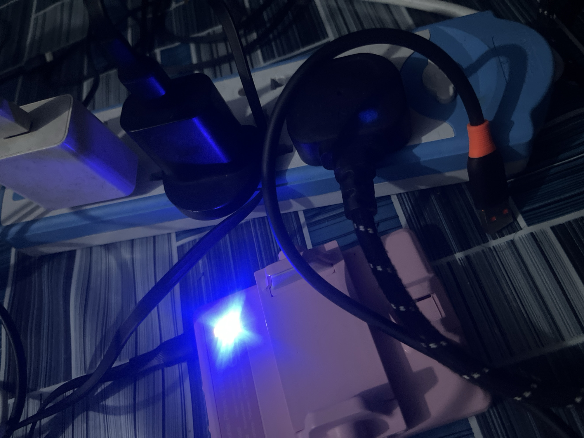 A top-down shot depicts a power strip in Dadi Riba, Nigeria, with several plugs inserted. The power strip is light blue and white. Plugs and cords of varying sizes, colors, and materials are seen, including black and orange USB cords, black power cords, and white and pink plug adapters. The pink adapter has a bright blue light emanating from it. The background surface appears to be a striped material.