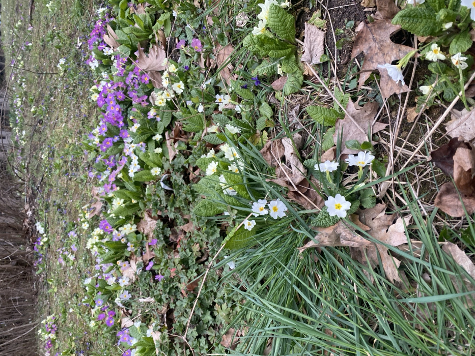 The image displays a close-up, ground-level perspective of a vegetated area in Sofia, Bulgaria. The ground is densely covered with flowering plants identified as primroses (Primula vulgaris) and other flora. Primrose blooms are prominent in white with yellow centers, pale yellow, and various shades of purple and lilac, emerging from rosettes of dark green, crinkled leaves. Patches of vibrant green grass and smaller, round-leaved ground cover plants are interspersed throughout the scene. Numerous dried brown deciduous leaves, some exhibiting lobed structures, litter the ground, co-mingling with thin, desiccated twigs. The background consists of out-of-focus dense vegetation. No human figures, animals, or man-made structures are visible. The scene exhibits soft, ambient lighting conditions.