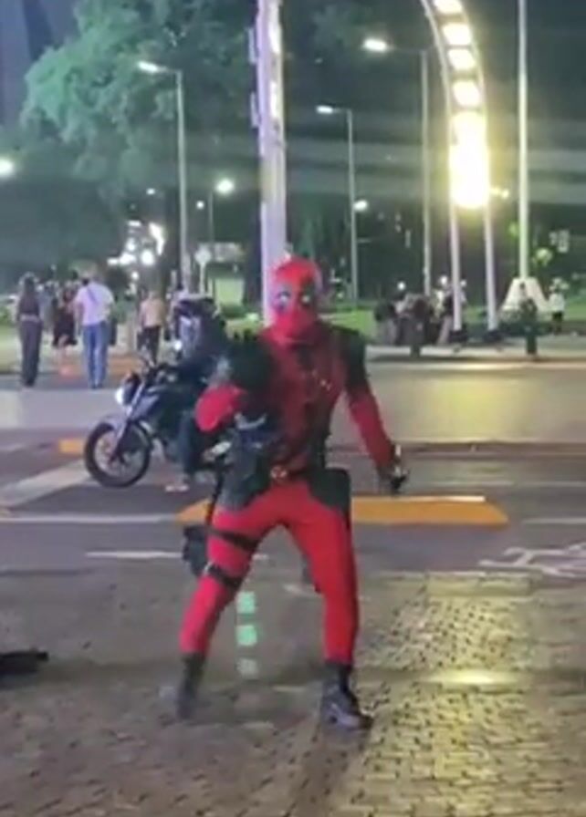 A person dressed in a Deadpool costume is dancing in the street at night. Several other people are standing in the background. There is a motorcycle parked nearby. A light post is visible in the background.