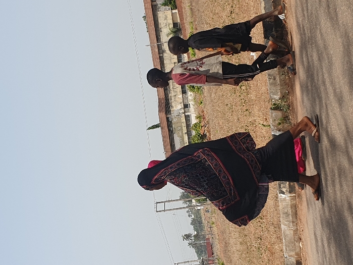 A group of four individuals walks along an asphalt road in Ogbogbo, Nigeria, under a clear, bright sky. The person in the lead, an adult female, is seen from the rear-right, wearing a black flowing garment with red and gold patterned embroidery, a black head covering, and light-colored flip-flops. Behind her, a second individual is partially visible, wearing a pink garment. Following them are two male children. The taller child wears a light grey t-shirt with red patterns, dark track pants with white side stripes, and dark flip-flops. The smaller child, slightly behind, wears a dark t-shirt, dark shorts, and dark flip-flops, carrying a light-colored item in his left hand. To the right of the road, a low concrete curb borders an expanse of dry, light brown scrub vegetation. In the background, multiple multi-story buildings with light-colored facades and dark roofs are visible behind utility poles and overhead power lines, amidst sparse distant trees.