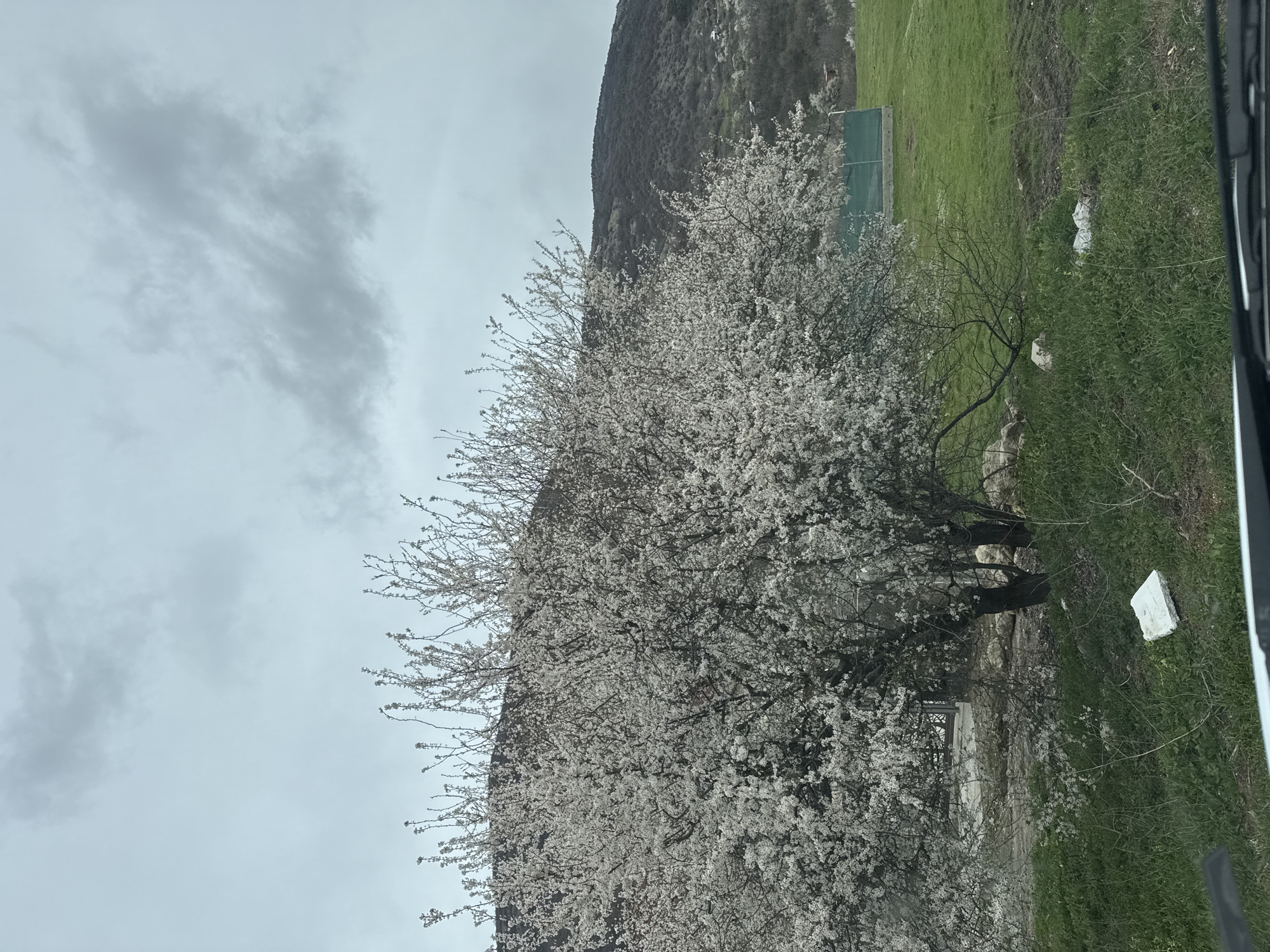 - "blossoming tree in the foreground against a backdrop of a grassy slope leading to a mountain or large hill" by FM-L5JpS2, licensed under CC BY 4.0