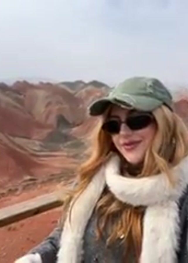 A woman wearing a gray sweater, white scarf, sunglasses, and a green baseball cap takes a selfie on a wooden walkway overlooking a mountainous landscape of red, yellow, and tan striped rock formations