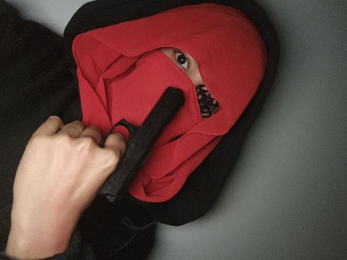 A person in a black hooded sweatshirt wears a red covering over their face, revealing only one eye. The person is holding a black handgun. A patterned black material peeks out from under the red covering near the eye. The background appears to be a plain gray or blue wall. The person’s right hand is on the gun's grip.