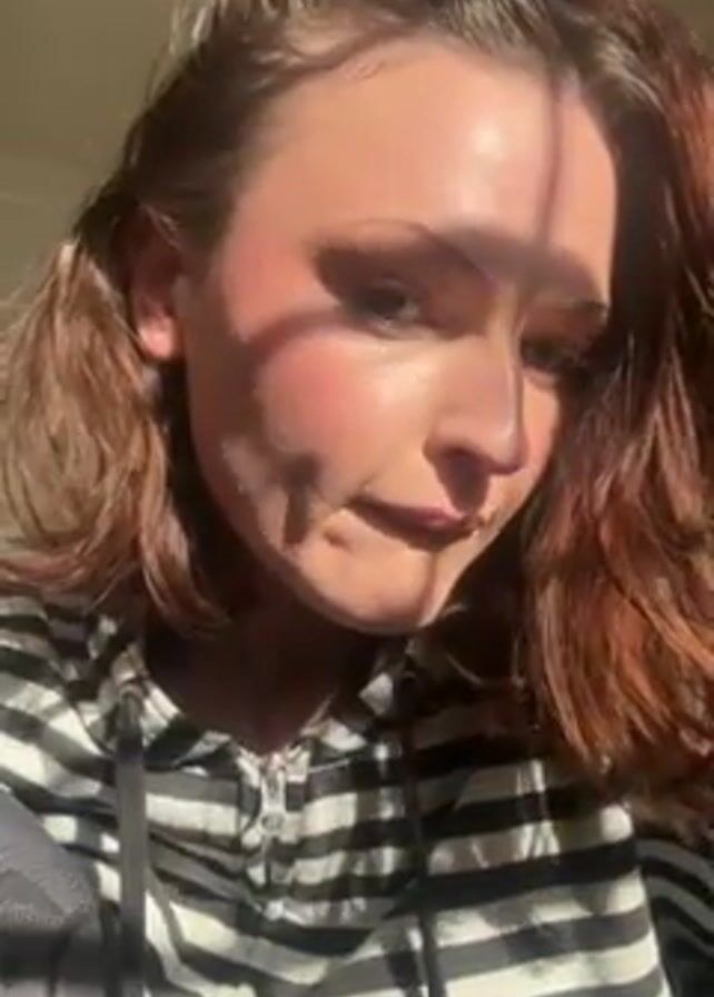 A woman with auburn hair and red blush on her cheeks is indoors, wearing a striped zip-up hoodie. Light streams in, casting shadows on her face. She runs her hands through her hair. The music is loud.