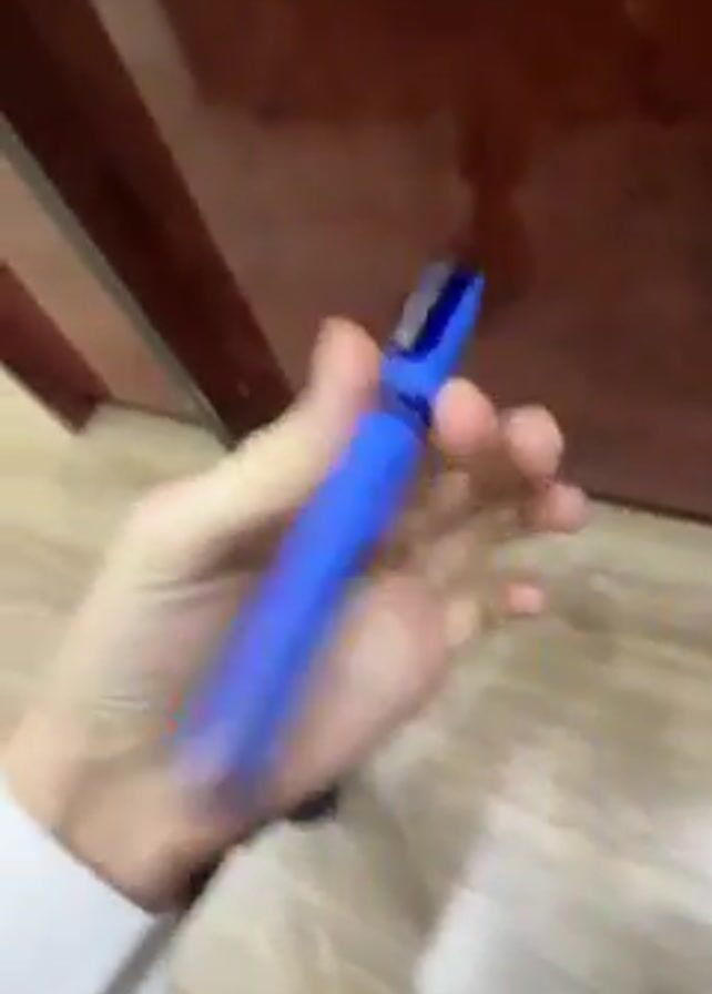 A pale-skinned person wearing a dark suit and a white cuff on their left wrist is holding a blue pen and twirling it between their fingers. The person is standing on a light-colored wooden floor near a dark brown wooden door. The video is slightly shaky.