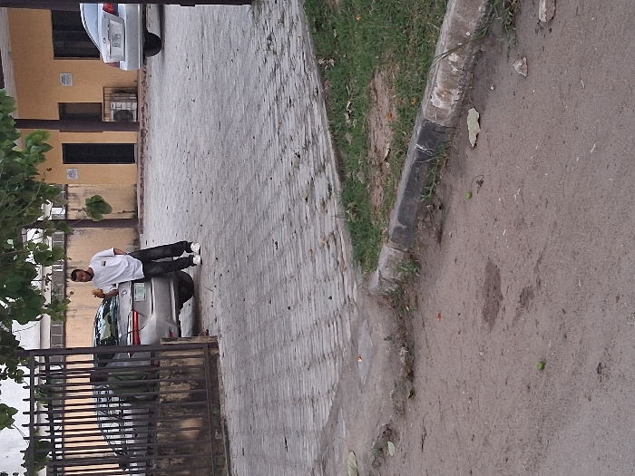 A person in a white shirt and dark pants stands next to a silver car parked on a brick-paved driveway. The car is near a gate and a building with dark-framed windows. To the right of the driveway is a narrow strip of grass bordered by a concrete curb. A sidewalk or road runs along the curb, displaying some debris and discoloration. The picture is taken from an elevated angle and has a slightly distorted, sideways perspective.