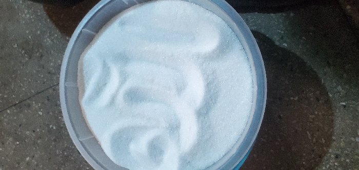 A white bucket filled with a granular white substance, possibly sugar or salt, occupies the frame