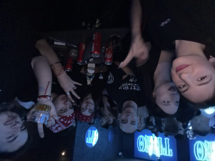 The image depicts an indoor nightlife scene at a venue in Plovdiv, Bulgaria, identified by prominent blue neon signs displaying "TIRO" and "TIPT" on the dark back wall. In the foreground, a group of seven individuals is positioned around a dark table. From left to right: 1. A female with dark hair, smiling directly at the camera, wearing a dark top, with her right hand raised and fingers spread. 2. Partially obscured by the first female, a second female with dark hair is visible, looking towards the right with a slight open-mouth expression. 3. A male with short dark hair, wearing a black t-shirt with a white graphic design on the chest and a circular emblem on the sleeve, looks at the camera with a neutral expression. 4. A female with dark hair, wearing a red bandana with a white pattern, looks towards the left with a slight smile. 5. A male with short dark hair, also wearing a red bandana, displays a "peace sign" (V-sign) with his left hand towards the camera. He wears multiple bracelets on his wrists. 6. A male with short dark hair and light facial stubble holds up a clear glass containing an amber liquid in his raised right hand. He also wears bracelets and looks directly at the camera with a slight smirk. On the table in front of the group, a partially visible bottle of Johnnie Walker Red Label whiskey is present, along with multiple red Coca-Cola aluminum cans and dark drinking glasses. The background shows additional blurred figures, indicating a crowded environment. The scene is dimly lit by ambient blue light, primarily from the neon signage, consistent with a bar or nightclub setting. The individuals are engaged in social interaction and posing for the photograph.
