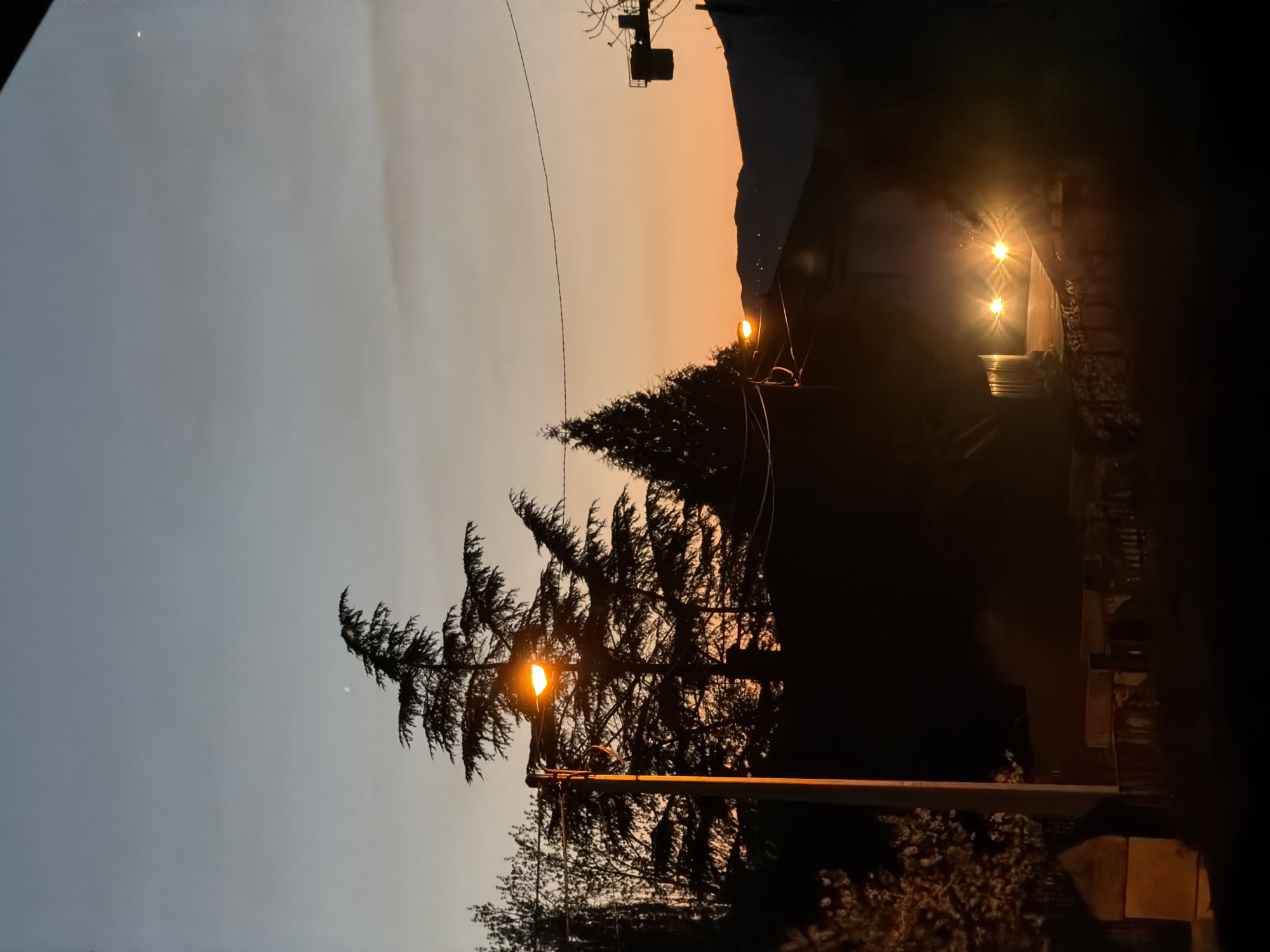 The image captures a twilight scene in what is possibly Vila Real, Portugal, characterized by a blend of natural and urban elements. The sky transitions from a pale grey to a muted orange hue, suggesting either sunrise or sunset. A prominent conifer tree stands in the foreground, its silhouette sharply contrasted against the sky. A street lamp, illuminated, is positioned in front of the tree, casting an orange glow. In the background, a building or house is partially visible, lit by multiple lights. Power lines stretch across the scene.