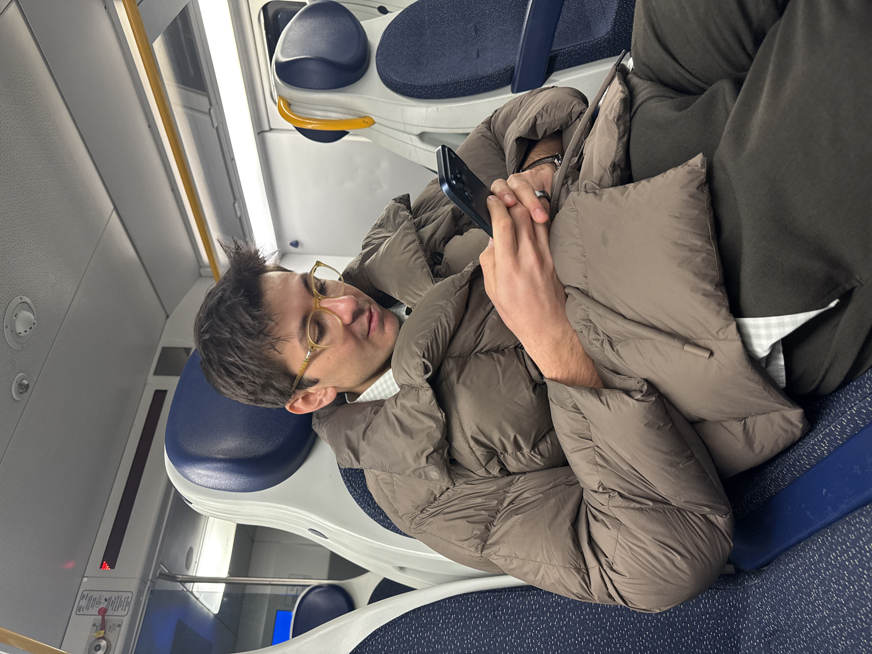 A person wearing glasses and a brown puffer jacket is seated on a train. They are holding a phone in their hands, appearing to be looking at the screen. The train interior is visible, including blue and white seats and overhead lights. The person is wearing dark trousers.