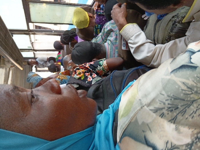 The image displays the crowded interior of a public transport vehicle, identified as being in Shangisha, Nigeria