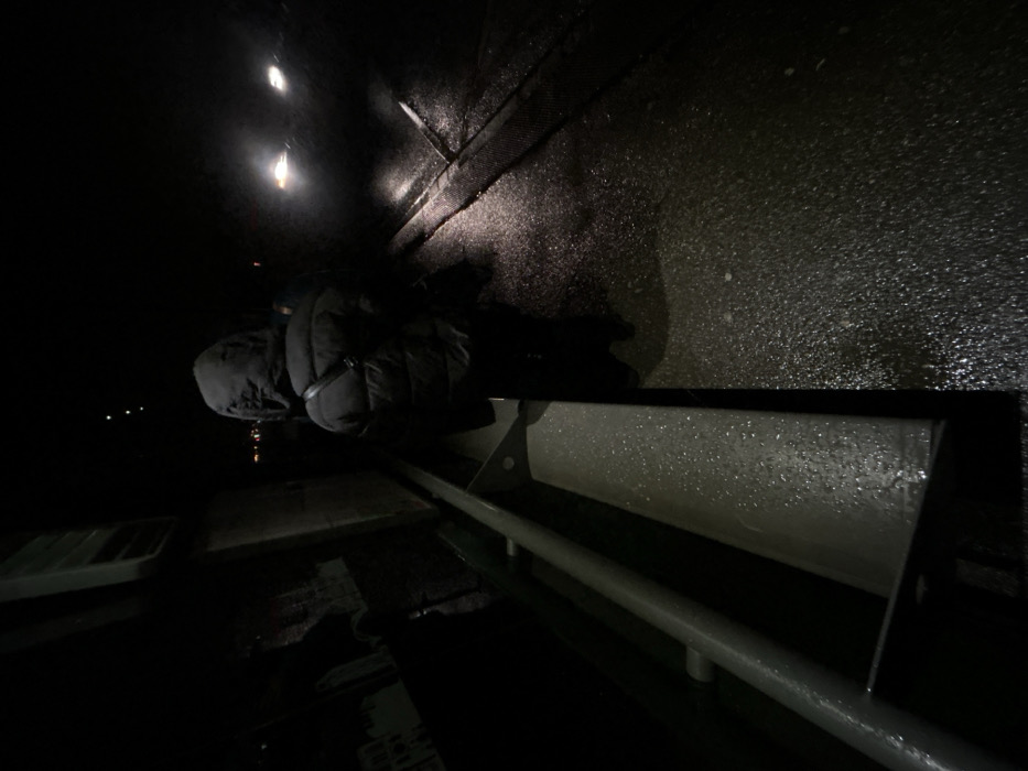In a dark, wet environment, a person bundled in a puffy coat and hood is positioned near a metal structure. The wall behind is dark and glistening with moisture, illuminated by two overhead lights. The metal structure, possibly a guardrail, is damp and reflects light. Below, a dark, reflective surface indicates water or a wet floor. The scene suggests a dock or platform at night in rainy conditions.