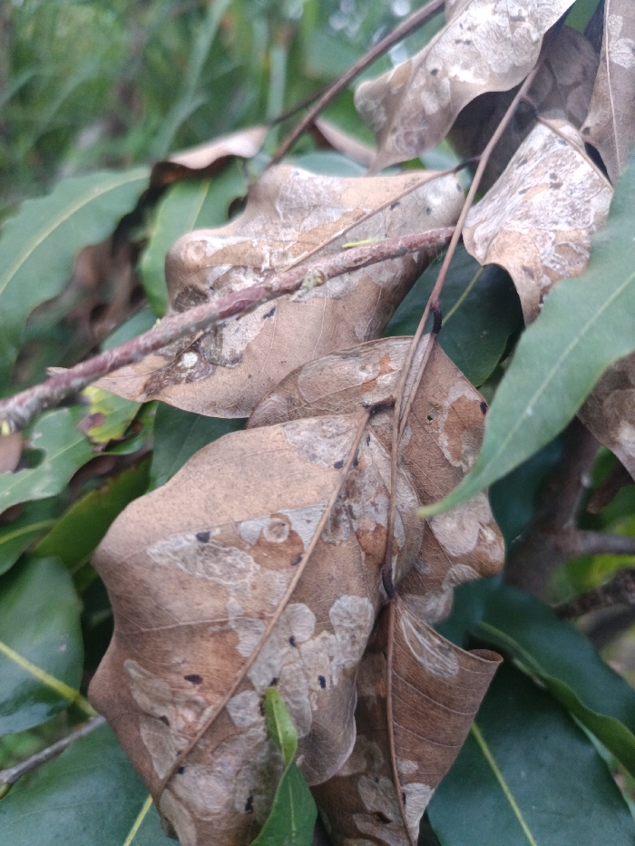 The image captures a close-up of desiccated brown leaves on a plant, located in Sindangasih, Indonesia