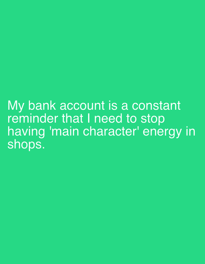 The scene, contextually situated in the city of Byala, Bulgaria, is a static digital image featuring a solid, vibrant green background. White, sans-serif text is centered horizontally within the lower half of the frame. The complete text reads: "My bank account is a constant reminder that I need to stop having 'main character' energy in shops." No individuals, discernible objects other than the text, or active events are visually present within this uniformly colored environment.
