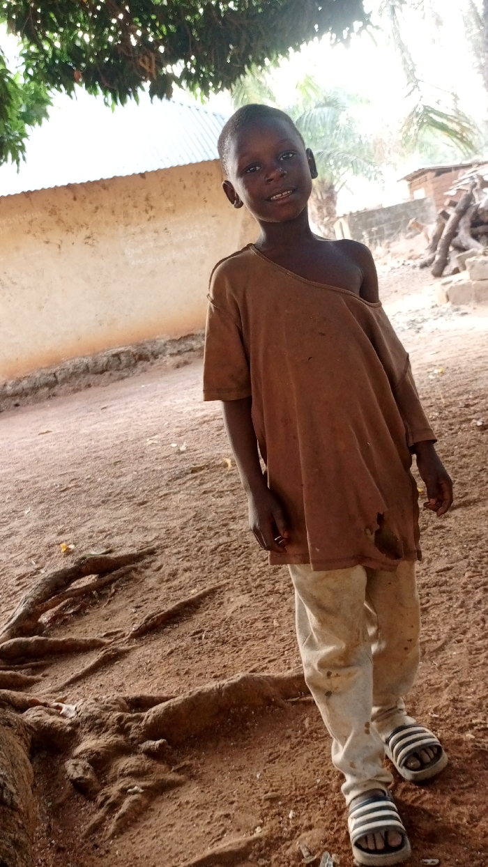 A young boy stands on a dirt ground with exposed tree roots. He wears worn, light-colored pants and striped sandals. His brown t-shirt is oversized and torn. Behind him is a weathered, light-colored building, and trees provide partial shade. The boy is facing the camera with a slight smile.