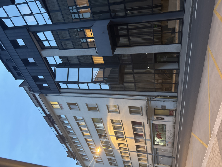 The image displays a street view in Strasbourg, France, at 11 Rue du Faubourg de Saverne, characterized by low light conditions under a clear, dim blue sky, suggesting either dawn or dusk. The foreground consists of an empty asphalt road marked with a double solid white line and yellow diagonal stripes on the left. On the left side of the street stands a multi-story building with a light-colored, possibly off-white, facade. It features numerous rectangular windows arranged horizontally across its five visible floors. The word "TOFIX" is painted in red on the facade between the third and fourth floors from the bottom. On the ground floor, a large window is obscured by red and black graffiti, including the word "silky," next to a dark recessed entrance. A streetlamp with a bright yellow light source illuminates the lower portion of this building. Adjacent to the white building on the right is a modern, multi-story structure with a dark, paneled facade heavily integrated with large, reflective glass panels. These panels mirror the blue sky and surrounding environment, with some sections angled outwards. Several internal lights are visible through the windows of both buildings, casting warm, yellow glows, particularly prominent in the modern building's mid-level windows. No individuals are present in the scene.