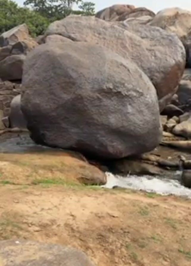 The camera captures a static shot of a rocky landscape with a small stream flowing between and under large boulders